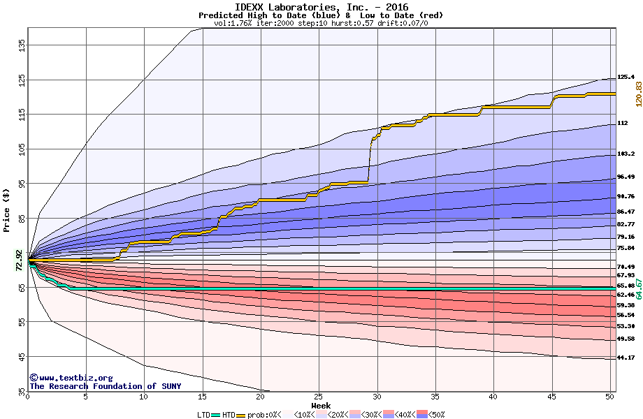 The high to date and low to date prices of the stock plotted against a random walk model for 2016 (what's this?).