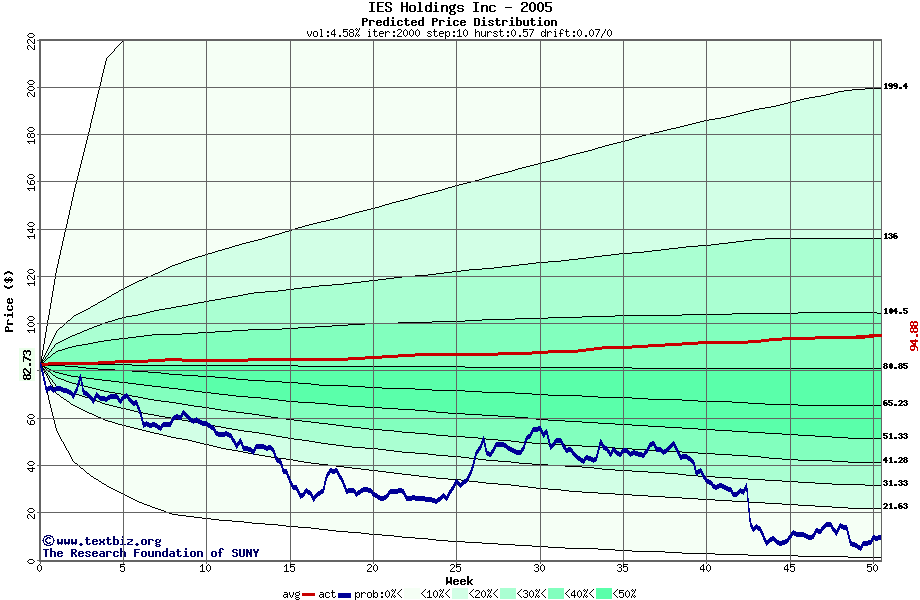 The following graph plots the year-to-date performance of the stock for 2005 compared to the probability calculated by a random walk model.