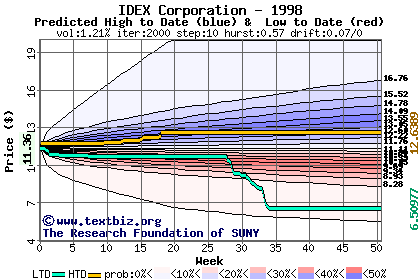 The high to date and low to date prices of the stock plotted against a random walk model for 1998 (what's this?).