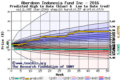 The high to date and low to date prices of the stock plotted against a random walk model for 2016 (what's this?).