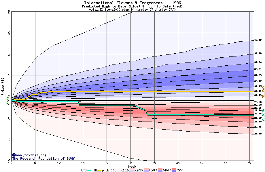 The following graph plots the year-to-date performance of the stock for 1996 compared to the probability calculated by a random walk model.