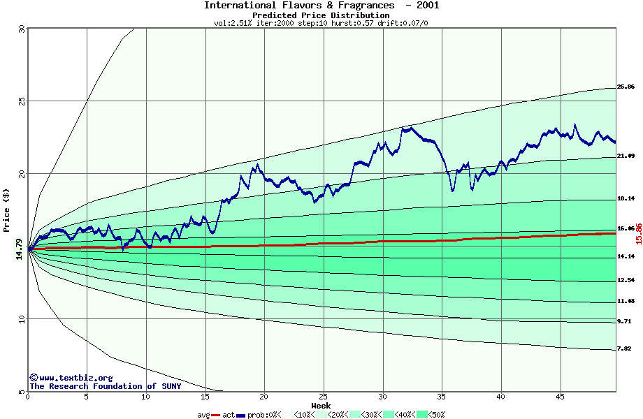 The following graph plots the year-to-date performance of the stock for 2001 compared to the probability calculated by a random walk model.
