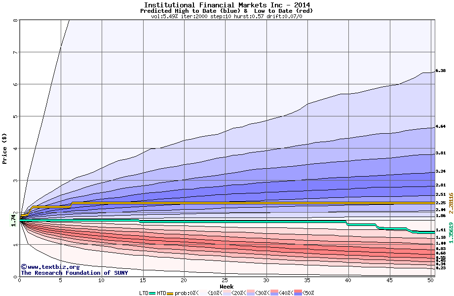 The high to date and low to date prices of the stock plotted against a random walk model for 2014 (what's this?).