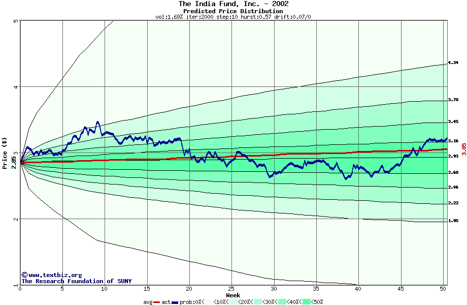 The following graph plots the year-to-date performance of the stock for 2002 compared to the probability calculated by a random walk model.