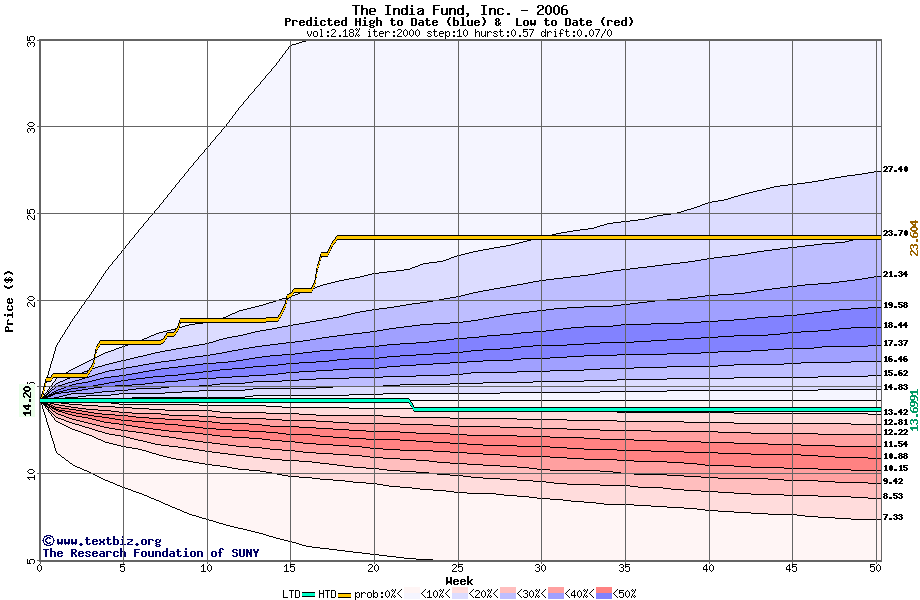 The high to date and low to date prices of the stock plotted against a random walk model for 2006 (what's this?).