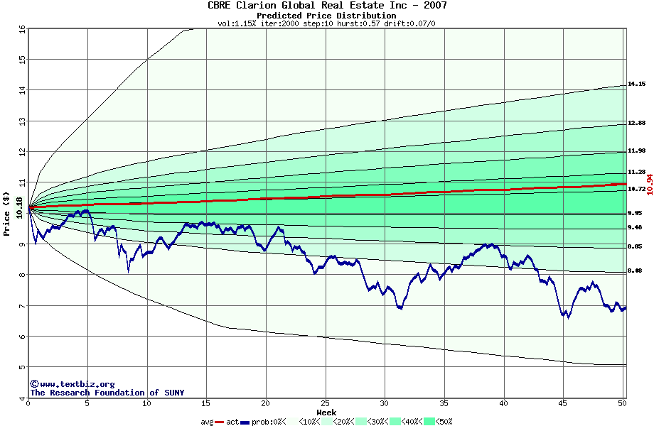 The following graph plots the year-to-date performance of the stock for 2007 compared to the probability calculated by a random walk model.