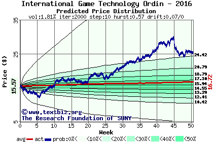 The high to date and low to date prices of the stock plotted against a random walk model for 2016 (what's this?).