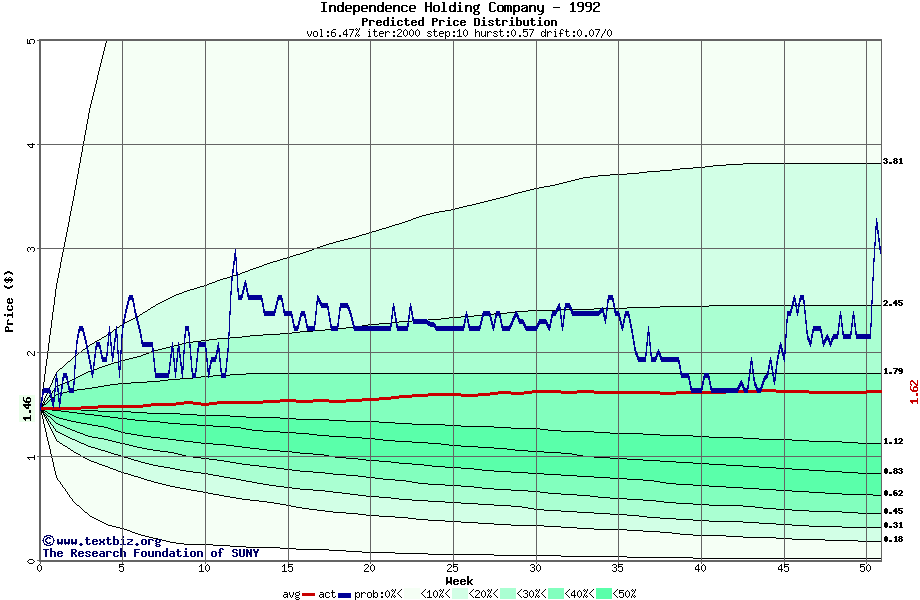 The following graph plots the year-to-date performance of the stock for 1992 compared to the probability calculated by a random walk model.