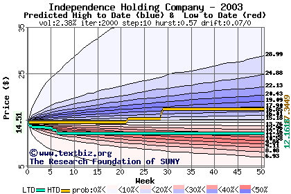 The high to date and low to date prices of the stock plotted against a random walk model for 2003 (what's this?).