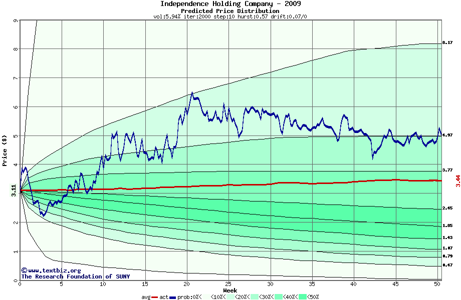 The following graph plots the year-to-date performance of the stock for 2009 compared to the probability calculated by a random walk model.