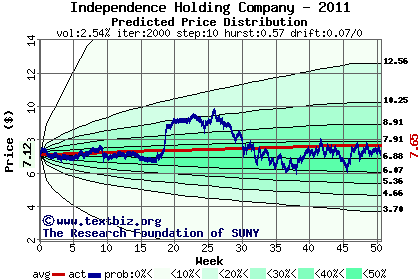 The high to date and low to date prices of the stock plotted against a random walk model for 2011 (what's this?).