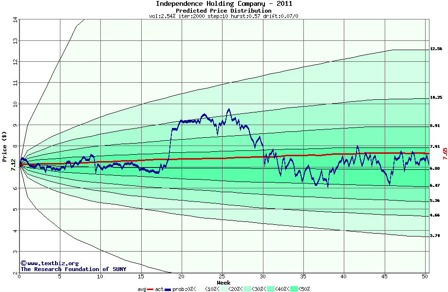 The following graph plots the year-to-date performance of the stock for 2011 compared to the probability calculated by a random walk model.