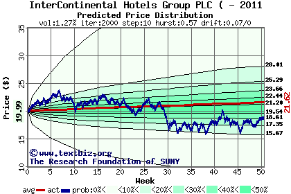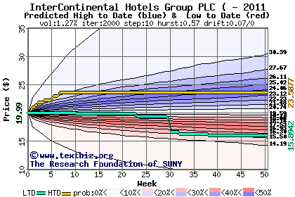 The high to date and low to date prices of the stock plotted against a random walk model for 2011 (what's this?).