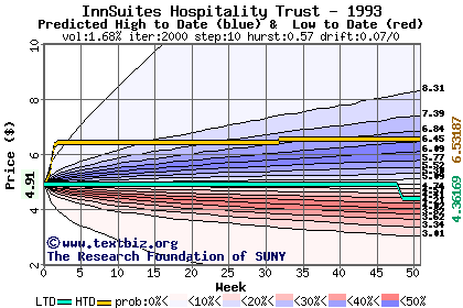 The high to date and low to date prices of the stock plotted against a random walk model for 1993 (what's this?).