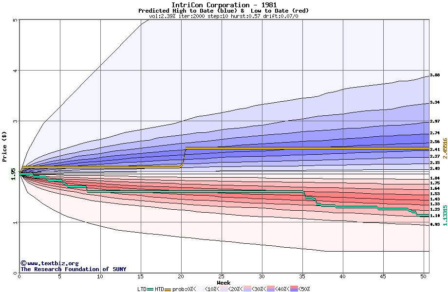The following graph plots the year-to-date performance of the stock for 1981 compared to the probability calculated by a random walk model.