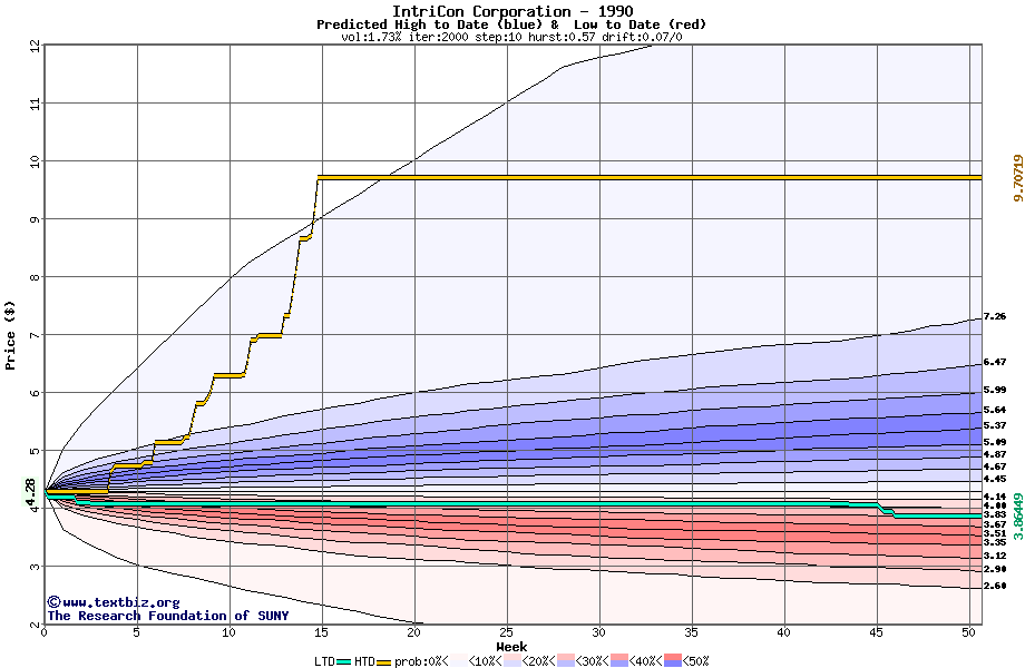 The following graph plots the year-to-date performance of the stock for 1990 compared to the probability calculated by a random walk model.