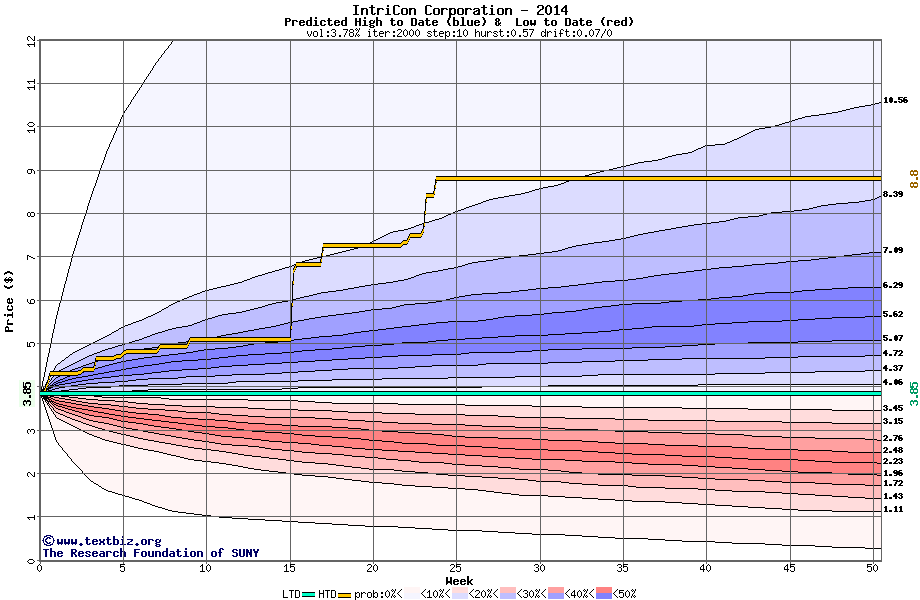 The high to date and low to date prices of the stock plotted against a random walk model for 2014 (what's this?).