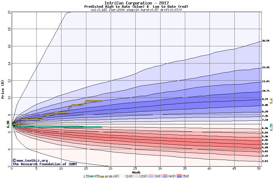 The high to date and low to date prices of the stock plotted against a random walk model for 2017 (what's this?).