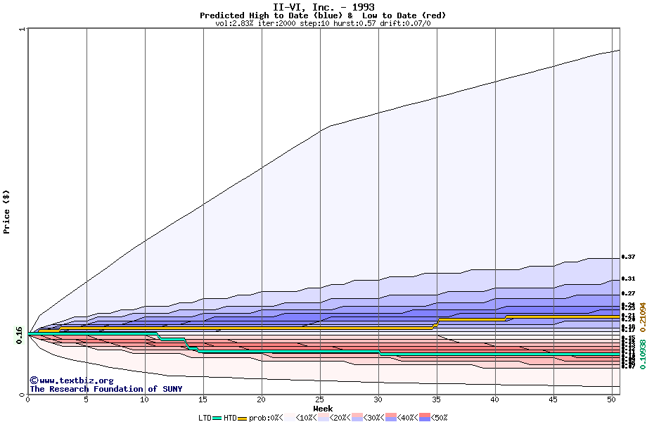 The high to date and low to date prices of the stock plotted against a random walk model for 1993 (what's this?).