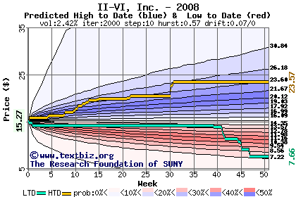 The high to date and low to date prices of the stock plotted against a random walk model for 2008 (what's this?).