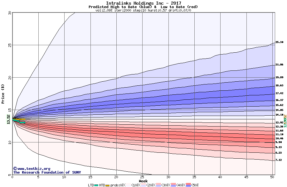 The high to date and low to date prices of the stock plotted against a random walk model for 2017 (what's this?).