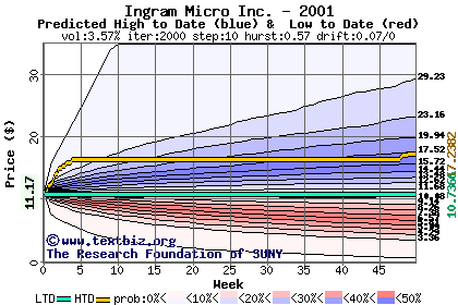 The high to date and low to date prices of the stock plotted against a random walk model for 2001 (what's this?).