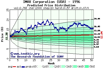 The high to date and low to date prices of the stock plotted against a random walk model for 1996 (what's this?).