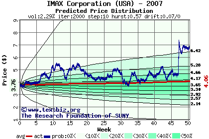 The high to date and low to date prices of the stock plotted against a random walk model for 2007 (what's this?).