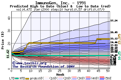 The high to date and low to date prices of the stock plotted against a random walk model for 1991 (what's this?).