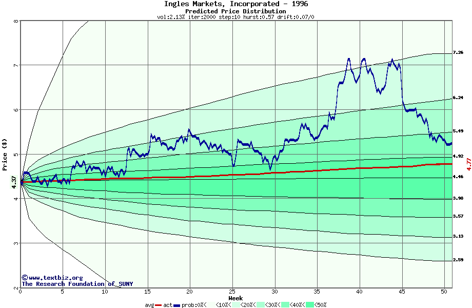 The following graph plots the year-to-date performance of the stock for 1996 compared to the probability calculated by a random walk model.