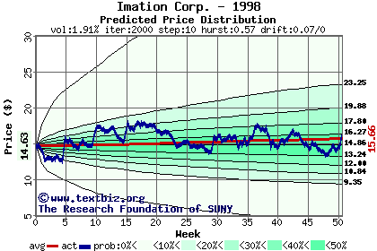 The high to date and low to date prices of the stock plotted against a random walk model for 1998 (what's this?).