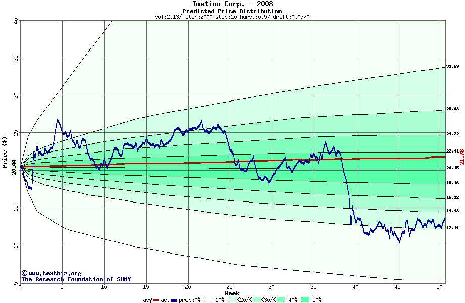The following graph plots the year-to-date performance of the stock for 2008 compared to the probability calculated by a random walk model.