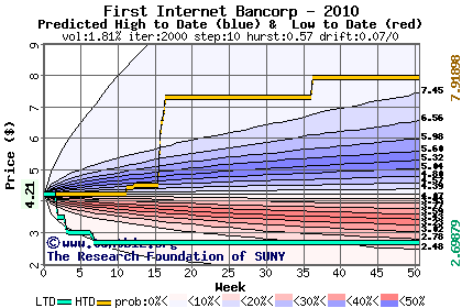The high to date and low to date prices of the stock plotted against a random walk model for 2010 (what's this?).