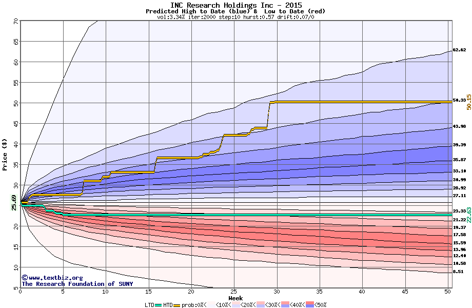 The high to date and low to date prices of the stock plotted against a random walk model for 2015 (what's this?).