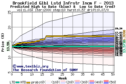 The high to date and low to date prices of the stock plotted against a random walk model for 2013 (what's this?).
