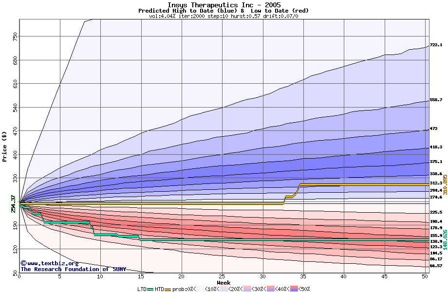 The high to date and low to date prices of the stock plotted against a random walk model for 2005 (what's this?).