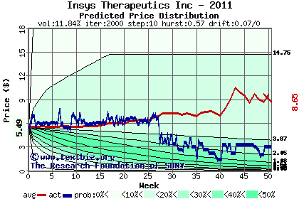 The high to date and low to date prices of the stock plotted against a random walk model for 2011 (what's this?).