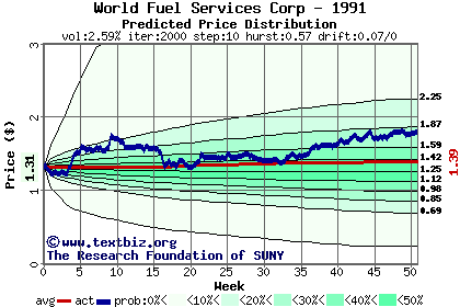 The high to date and low to date prices of the stock plotted against a random walk model for 1991 (what's this?).