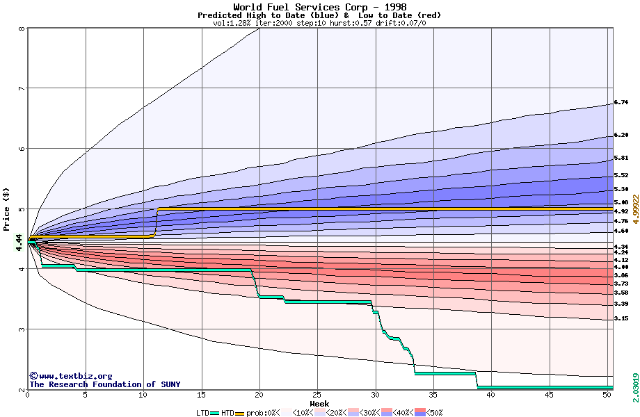 The high to date and low to date prices of the stock plotted against a random walk model for 1998 (what's this?).