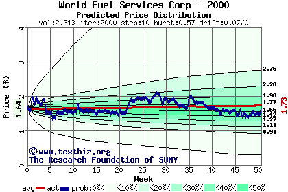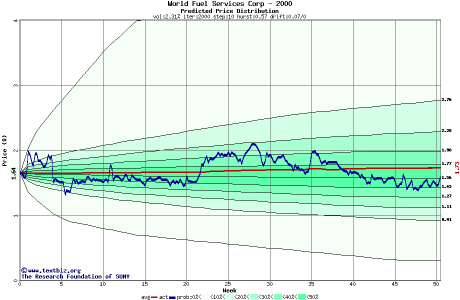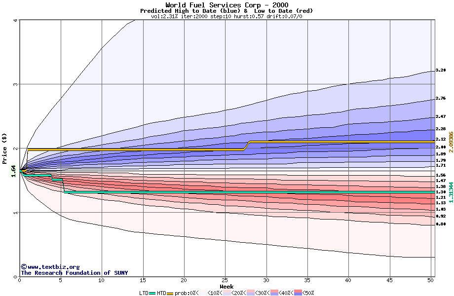 The high to date and low to date prices of the stock plotted against a random walk model for 2000 (what's this?).