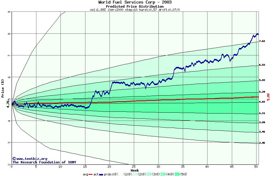 The following graph plots the year-to-date performance of the stock for 2003 compared to the probability calculated by a random walk model.