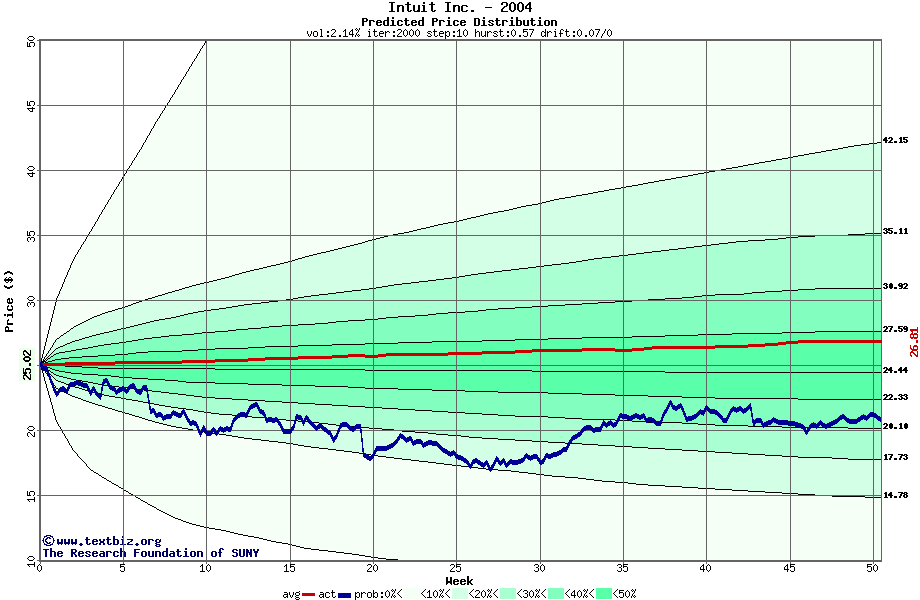 The following graph plots the year-to-date performance of the stock for 2004 compared to the probability calculated by a random walk model.