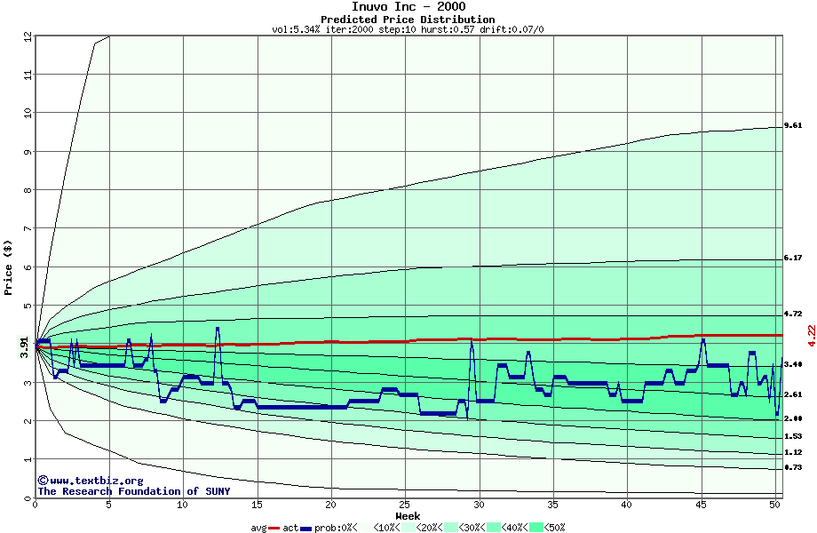 The high to date and low to date prices of the stock plotted against a random walk model for 2000 (what's this?).