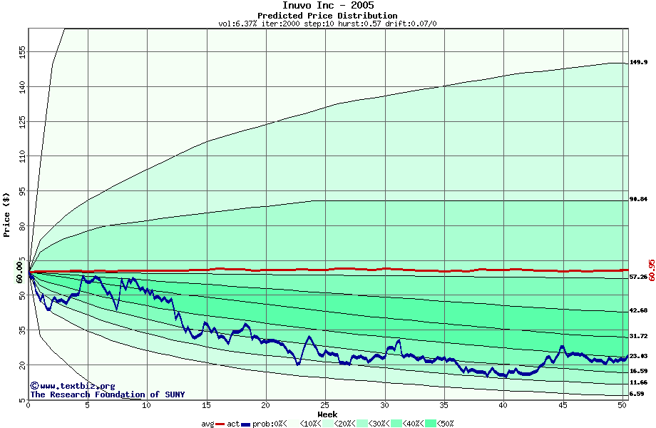The following graph plots the year-to-date performance of the stock for 2005 compared to the probability calculated by a random walk model.