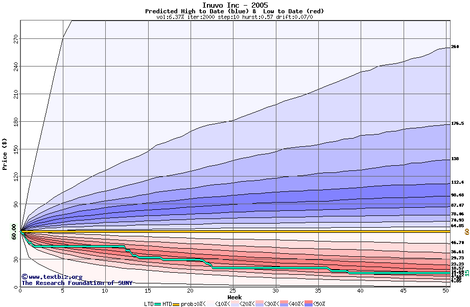 The high to date and low to date prices of the stock plotted against a random walk model for 2005 (what's this?).