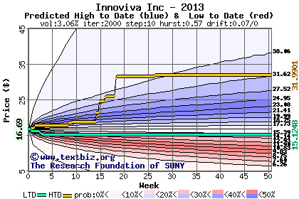 The high to date and low to date prices of the stock plotted against a random walk model for 2013 (what's this?).