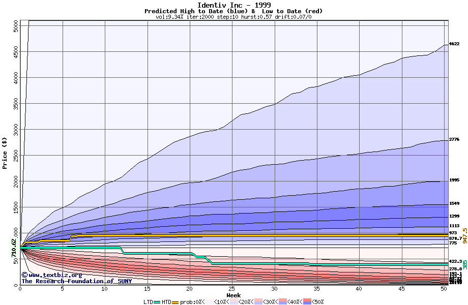 The high to date and low to date prices of the stock plotted against a random walk model for 1999 (what's this?).