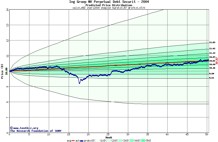 The following graph plots the year-to-date performance of the stock for 2004 compared to the probability calculated by a random walk model.