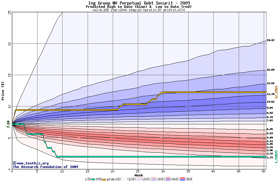 The high to date and low to date prices of the stock plotted against a random walk model for 2009 (what's this?).