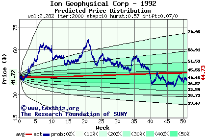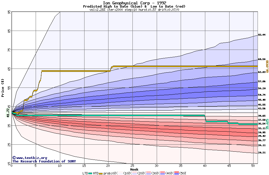 The following graph plots the year-to-date performance of the stock for 1992 compared to the probability calculated by a random walk model.
